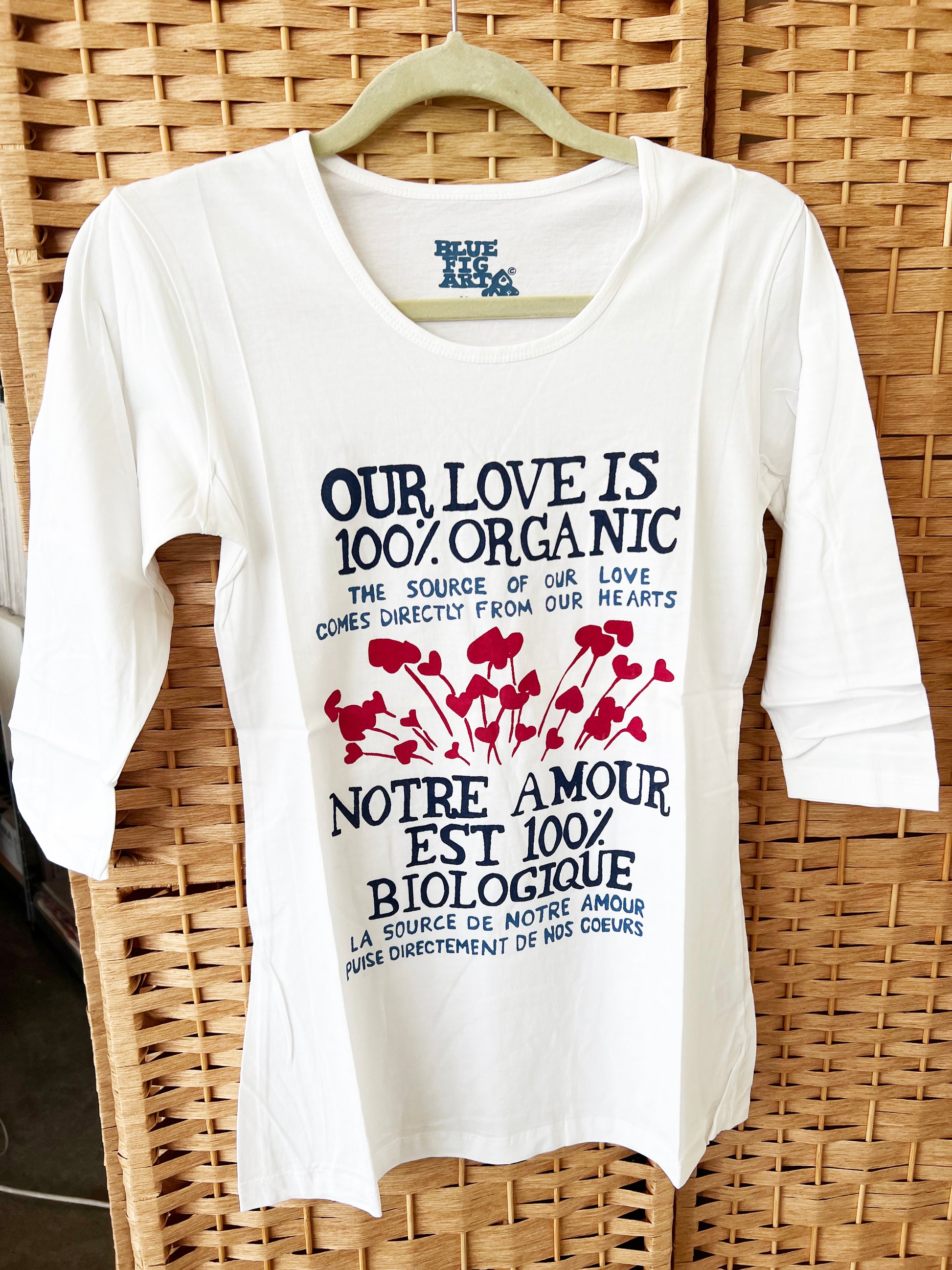3/4 sleeve tshirt, 100% cotton, Digital print: OUR LOVE IS 100% ORGANIC (Navy Combo), by American/Greek Artist Christine Smith