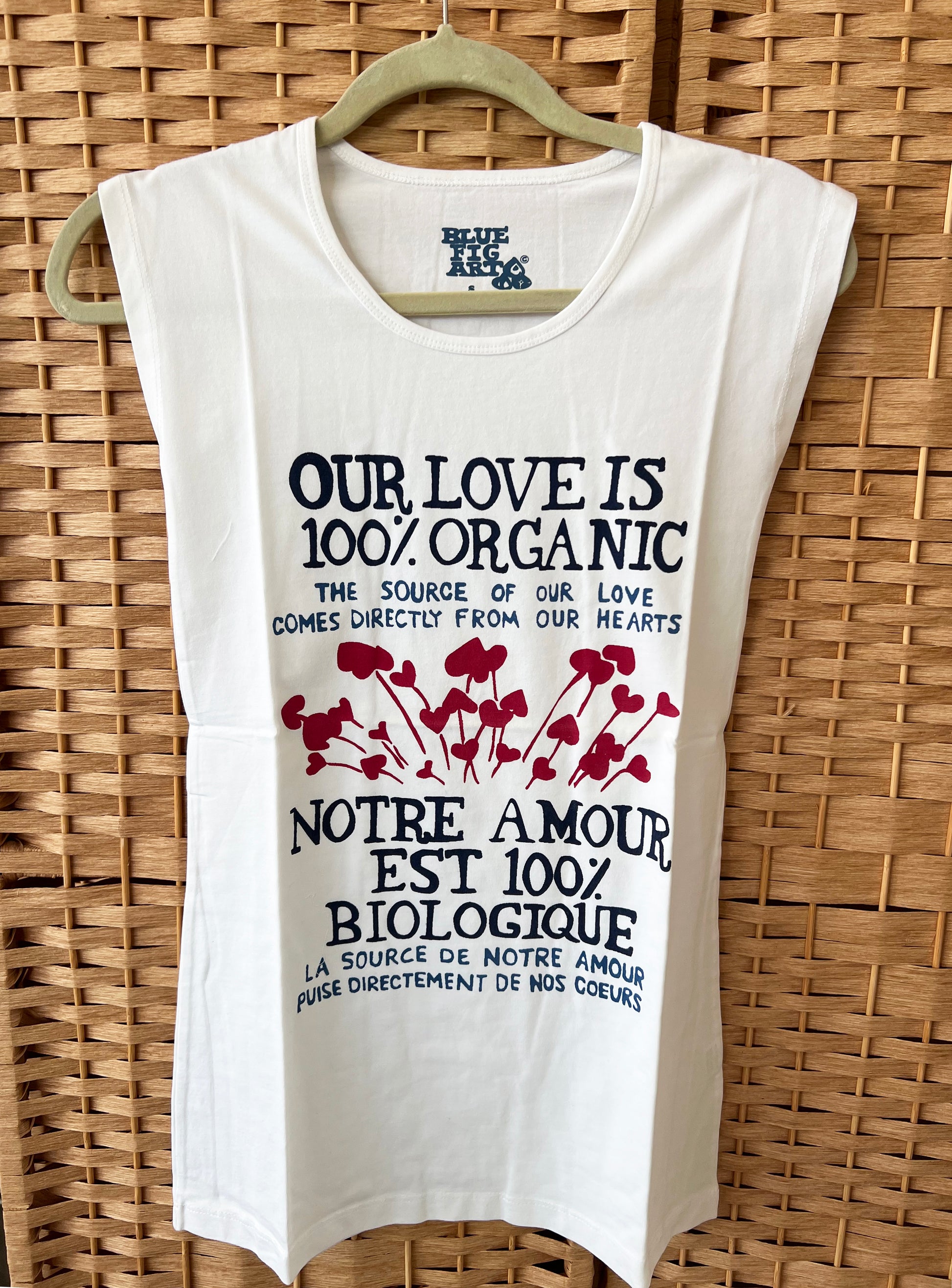 Cap sleeve Tshirt, 95% cotton, 5% Spandex, Digital print: OUR LOVE IS 100% ORGANIC (Navy Combo), by Artist Christine Smith