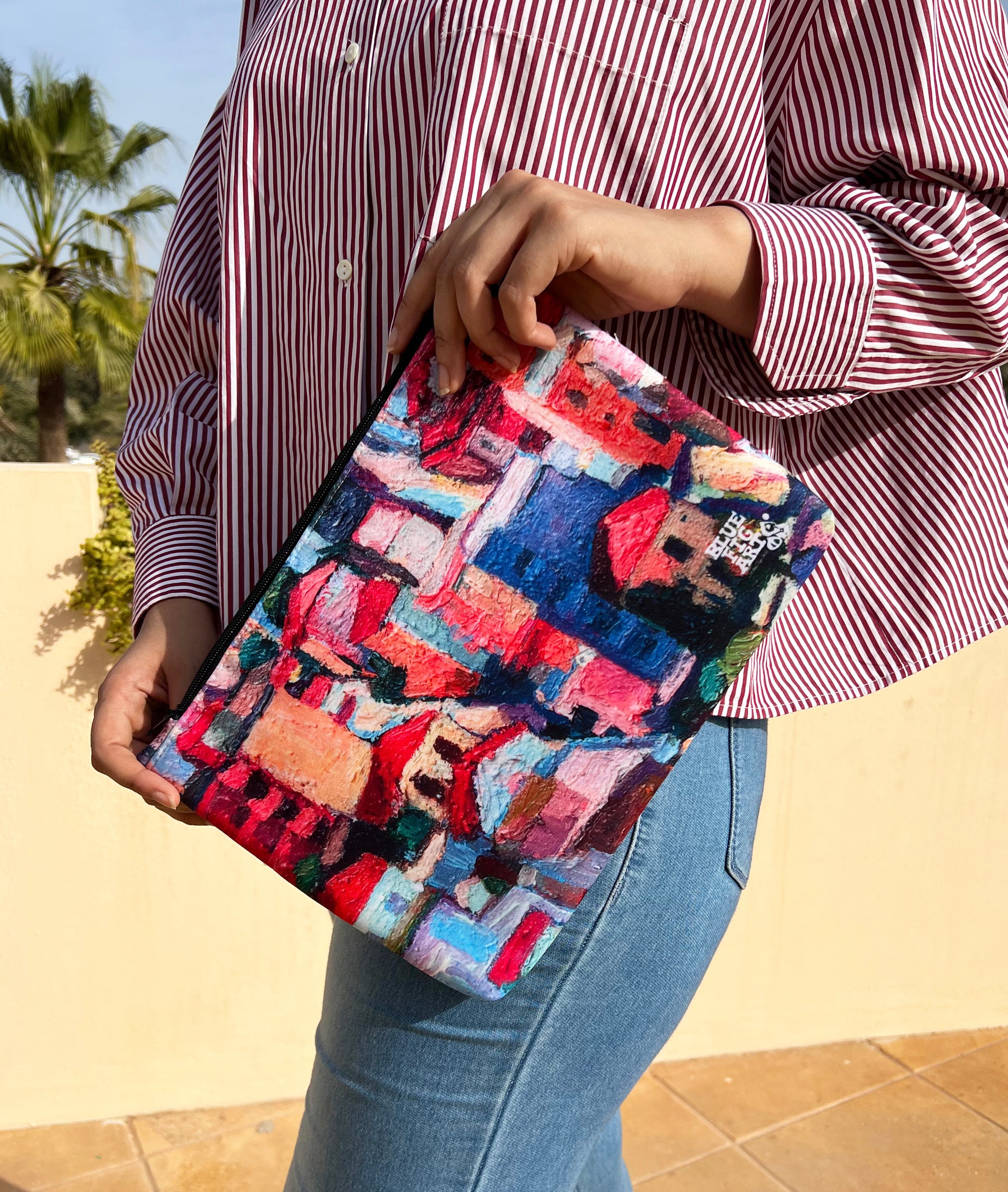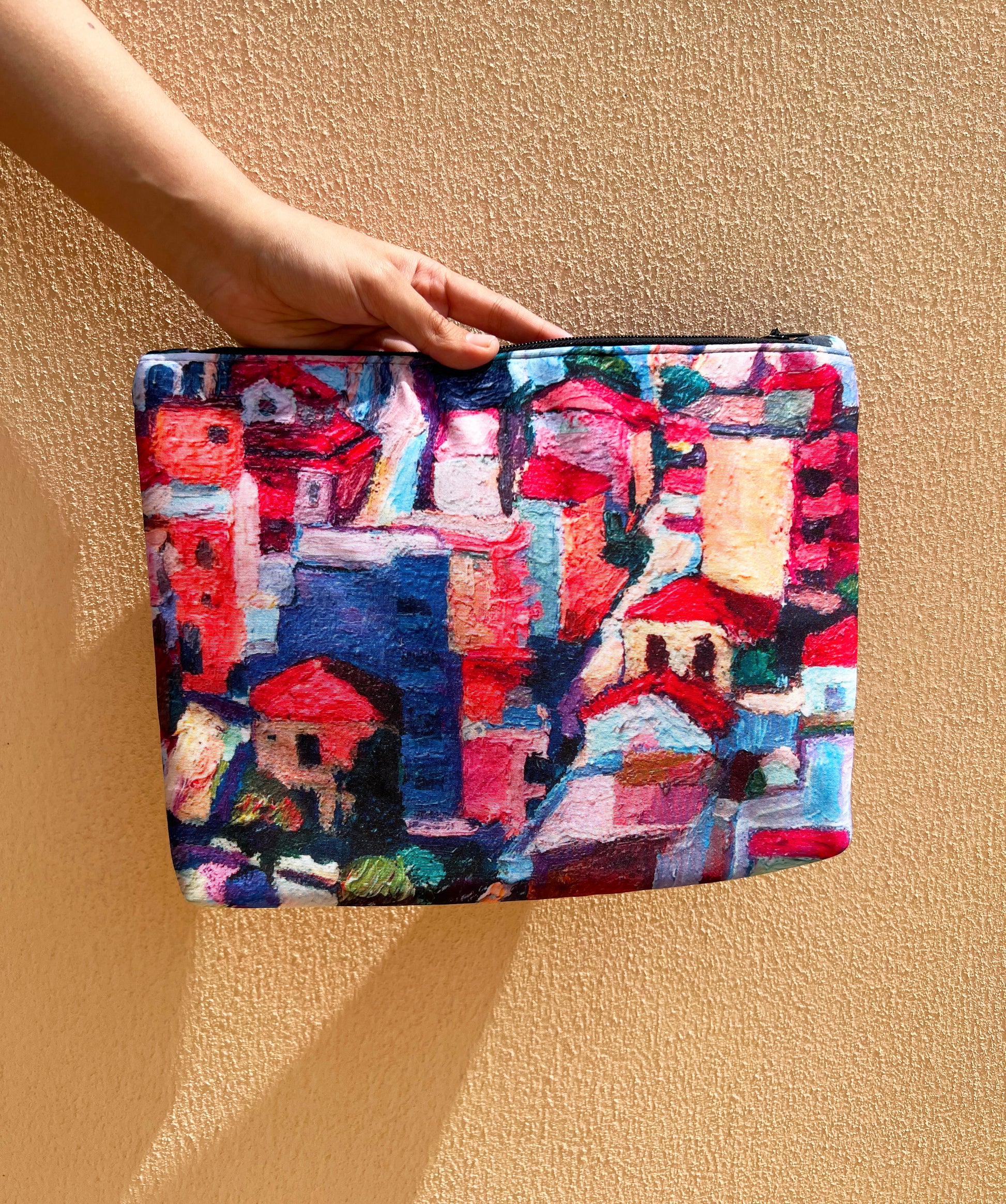 Digital print Kavala painting pouch by American/Greek Artist Christine Smith, A triple layered pouch in a premium quality crepe fabric.